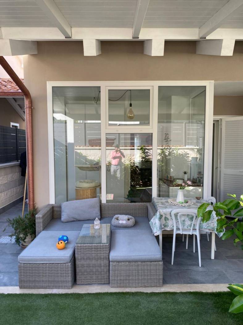 la corte posteriore, perfetta come zona relax, arricchita da una serra solare che dona luminosità agli ambienti interni.