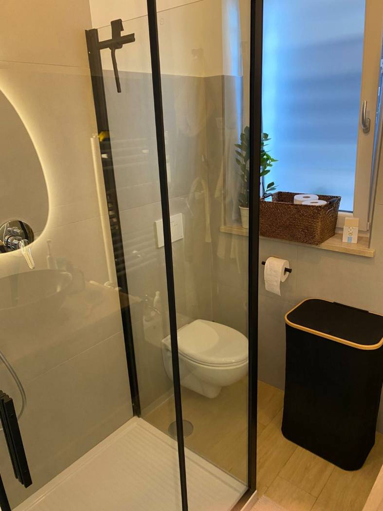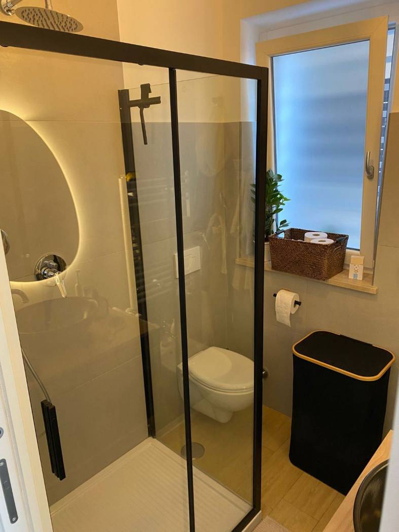 un bagno finestrato con box doccia, rifinito e moderno.
